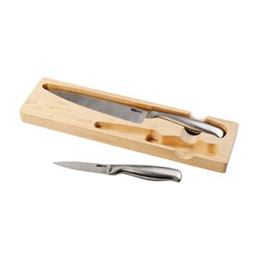 Set de 2 couteaux à découper en inox brossé, 1 couteau de chef 34 cm,lame 20 cm, 1 couteau office 21 cm, lame 9 cm, lame et manche d'une seule pièce garantissant une hygiène parfaite, coffret en pin, verso rangement, recto planche à découper