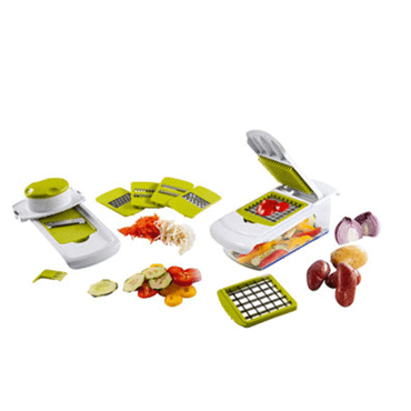 Mandoline et coupe-légumes, 2 en 1, un récipient antidérapant, un support de grille, un couvercle mandoline, un poussoir, un outil de nettoyage en plastique, 5 lames interchangeables en acier inoxydable et 2 grilles de découpe de 10 et 16 mm, pour râper, trancher, émincer, effiler, découper finement et précisément ou réaliser une julienne