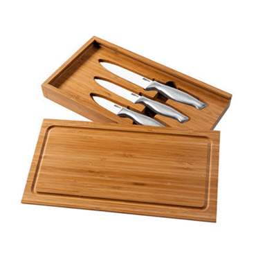 Set de 3 couteaux lame céramique, manche inox brossé, en boite bambou dont le revers du couvercle sert de planche à découper, taille des lames: 7,5 , 10 et 12,5 cm