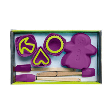 7 moules en silicone, 6 emporte pièces en plastique PP, 1 grande spatule, 1 petite spatule, 1 pinceau en silicone, manche en bois