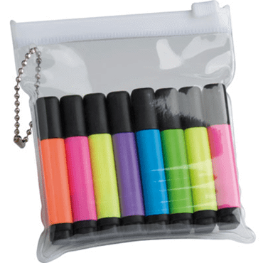 8 mini marqueurs de différentes couleurs dans une pochette transparente avec fermeture à glissière et chainette