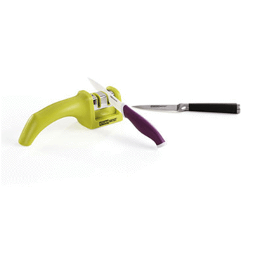 Aiguiseur de couteaux métal et céramique, 2 meules : 1 coté carbure de Tungsten et 1 coté céramique, manche plastique Conseils d?utilisation : Passez votre couteau ou ciseau dans chaque meule, en commençant par le coté métal puis le coté céramique. La première partie de l'aiguiseur en carbure de Tungsten (gros grain) aiguise le fil émoussé. La deuxième partie en céramique créée un fil poli (grain fin).