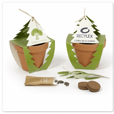 Mini kit 80 mm arbre Présentation : Kit de semis pour semer, voir pousser et ensuite replanter un arbre. Composition : 1 pot terre cuite ø 80 mm, 2 plaquettes de terre de coco, 1 sachet de graines d'arbre (ex : Epicéa - Pin - Olivier). Longueur : 90 mm. Largeur : 80 mm. Hauteur : 130 mm. Poids : Environ 135 gr. Personnalisation : Le fourreau découpé en forme d'arbre est imprimé en quadrichromie à votre communication, sur du papier issu de forêts gérées durablement avec des encres végétales et protégé par un vernis à l'eau sans solvant. Options : Tampographie sur le pot en terre cuite. Quantite minimum : 500ex. Prix indiqué hors frais techniques et frais de transport