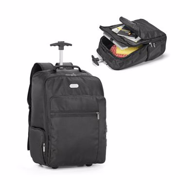 Sac à dos trolley pour ordinateur. 1680D et 300D. Compartiment principal doublé et rembourré, avec séparateur rembouré pour ordinateur de 17''. 2 poches frontales et 2 poches latérales avec zipper. Avec protection de roues. Anses rembourrées. Poignée extensible en métale avec ressort. Plaque métallique aimantée amovible pour marquage. Capacité jusqu'à 22 L. Poids: 1.80 kg. 330 x 490 x 220 mm | Plaque métallique: 50 x 20 mm