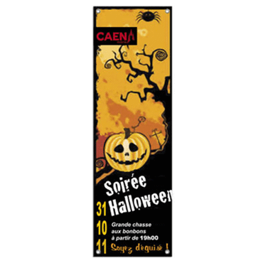 Bâches extérieure < 1 et > 2 m linéaire. Livrée roulée. Durée de vie 2 à 3 mois. Descriptif marquage : 2 mm de débord si fond Plus commercial : 4 oeillets inclus - résistance aux rayures