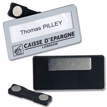 Badge magnétique réutilisable. N'abîmez plus vos vêtements grâce à un astucieux système de fixation magnétique. Marquage partie inférieure fixe, en sérigraphie possibilité plusieurs couleurs, NOIR conseillé et par défaut. Livré en sachet individuel.