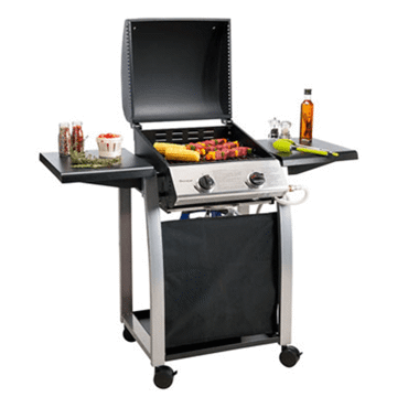 Barbecue à gaz, 2 brûleurs à réglage indépendant, allumage piezo, 2 plaques émaillées amovibles, couvercle, tiroir de récupération des graisses, tablettes latérales rabattables, 4 roulettes pour faciliter le déplacement, grand espace de rangement pour la bouteille de gaz, compatible butane et propane