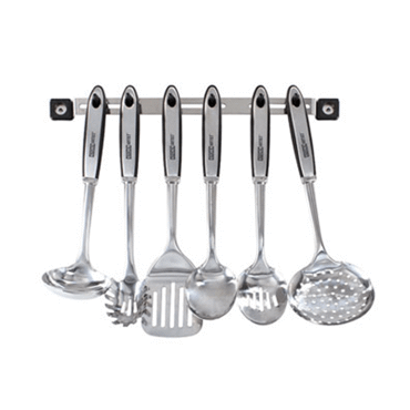 Barre de suspension, 1 cuillère à spaghettis, 1 cuillère à servir, 1 cuillère à égoutter, 1 louche, 1 écumoire, 1 pelle, fixation murale