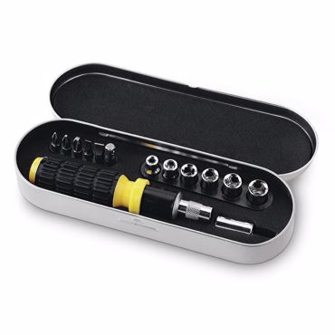 Outils métalliques avec éléments en plastique et gomme dans une boîte métallique, 14 fonctions. boîte 200 x 30 x 65 mm