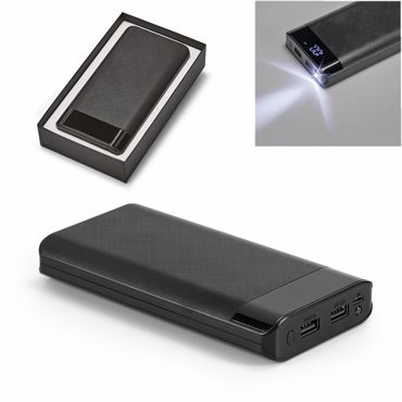 Batterie nomade. ABS. Batterie de lithium. Capacité: 16'000 mAh. Durée de vie = 1'000 cycles. Avec entrée 5V/2'1A, sortie 5V/1-2'1A, indicateur de charge, 2 ports usb et 1 port micro-usb. Avec protection pour la surcharge et court-circuit et surchauffe. Câble USB/micro USB pour chargement batterie inclu. Livrée dans coffret cadeau. 156 x 80 x 23 mm | Coffret: 175 x 100 x 30 mm