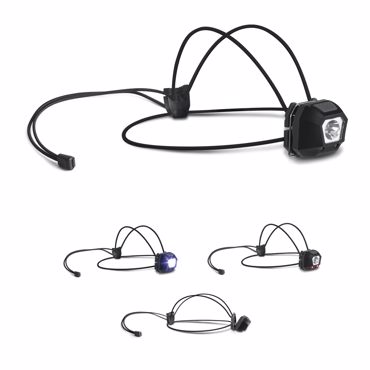 Lampe frontale en ABS avec boucle, 1 lampe blanche (1W), 2 LED rouges avec fonction clignotant. Comprend 2 piles au lithium CR2032. Cette lampe est fournie dans la boîte. 55 x 38 x 45 mm