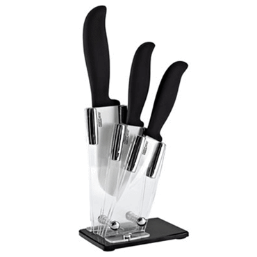 Bloc design acrylique, 3 couteaux céramique manche gomme, lame blanche, 7,6 cm, 10 cm et 12,7 cm, anticorrosion, antioxydation, anallergique, ne donne ni goût ni odeur aux aliments, tranchant incomparable