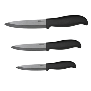 Bloc design acrylique, 3 couteaux céramique manche gomme, lame carbone noire oxyde de zirconium, 7,6 cm, 10 cm et 12,7 cm, anticorrosion, antioxydation, anallergique, ne donne ni goût ni odeur aux aliments, tranchant incomparable