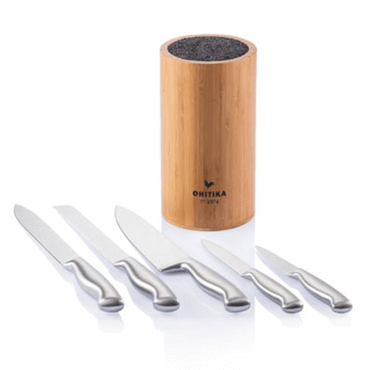 Bloc universel en bambou vous permettant d?organiser vos couteaux selon vos souhaits. Livré avec un long couteau de chef 8?, un couteau à pain 8?, une trancheuse 8?, un couteau utilitaire 4,5? et un éplucheur 3.5?. Un bel ensemble complet pour tous vos travaux de cuisine.
