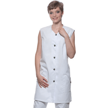 Blouse sans manches femme. -Col V. -Fermeture boutonnée. -Coupe ample. -2 poches latérales. -65 % polyester 35 % coton. -Poids : 215 gr m/². -Lavable à 95°C. -Sanfore : Traitement des tissus de coton contre le rétrécissement.. -