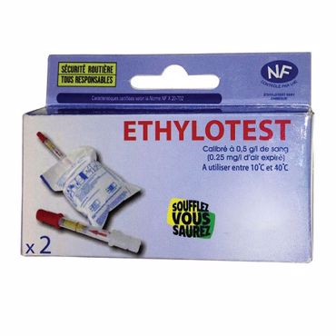 Un éthylotest NF X20-702, taux : 0,25 mg par litre d'air expiré équivalent à 0,5 g par litre de sang, composition : 1 test réactif. 1 ballon muni d'un embout buccal avec valve. 1 sachet transparent avec marquage de la traçabilité, mode d'emploi imprimé sur le ballon, manipulation du test simple et rapide, confort d'utilisation grâce à l'embout de grande taille qui permet le gonflage du ballon sans aucun effort, facilité de lecture avec grille des différentes couleurs pour validation.