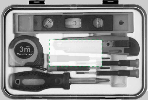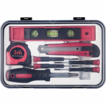 Boîte à outils de 9 pièces comprenant des tournevis de précision, tournevis, cutter, lames, niveau, mètre-ruban dans une boîte en plastique.