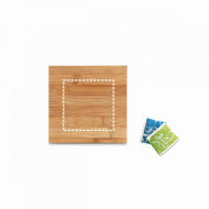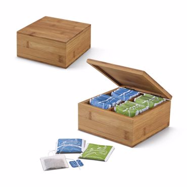 Boîte à thé. Bambou. Avec 4 compartiments. Fermeture aimantée. Incluant 40 sachets de thé açorien "Gorreana" (noir et vert). Livré dans boîte kraft. 160 x 160 x 78 mm | Boîte kraft: 166 x 166 x 85 mm