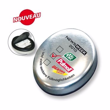 Boîte en fer-blanc argentée avec fermeture à clapet en plastique, réutilisable, opercule fraîcheur avec languette douverture Env. 25 g de pastilles à la menthe, sans sucre, rondes 9 mm ou ovales 19 x 13 mm Possibilité d'obtenir la garniture avec : tic tac, Pulmoll, Chewing gum sans sucre. Avec supplément.