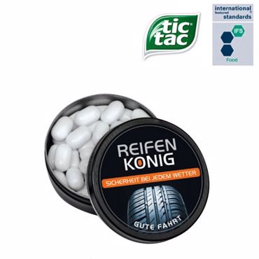 Boite pastille pour la gorge. Boîte de poche XS noire, blanche, argentée ou dorée, réutilisable, opercule fraîcheur avec languette d'ouverture, garni d'env. 20 g de tic tac FRESH MINTS ou de tic tac FRESH ORANGE. ou 20 g de bonbons Pulmoll (citron, orange, sureau), sans sucre avec vitamines C ou 20 g de Chewing gum sans sucre. Conservation env. 9 mois si le produit est conservé dans un endroit approprié.