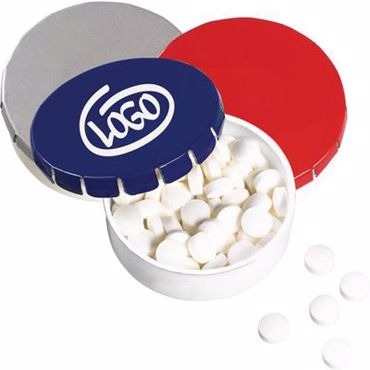Bonbon boîte clic clac. Boîte distributrice en matière synthétique avec couvercle en métal et système à cliquet pratique. Rempli avec environ 12 g (± 75 pcs.) de bonbons à la menthe sans sucre. bleu/blanc, rouge/blanc, argenté/blanc, jaune/blanc, blanc
