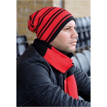 100% polyacrylique. Tricot épais jauge 6. Coupe-vent. Rayé à l'extérieur, uni à l'intérieur. Bonnet long pour pouvoir le retourner selon le style souhaité. La 3ème teinte des coloris proposés correspond au côté uni. Grammage du produit : 1: 4,60 € HT