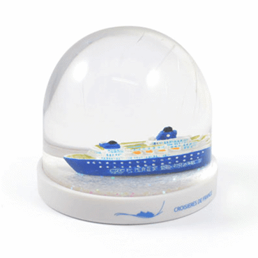 Boule neigeuse aqua (grand modèle). Prix incluant un marquage une couleur sur le socle + 1 flotteur. Insert de neige ou paillettes. Dimensions 85x80 mm. Liquide couleur au choix. Délai 14 semaines.