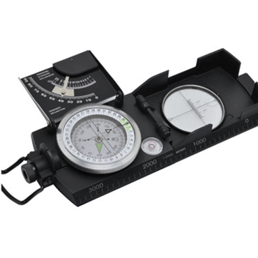 Boîtier en métal noir avec insert d'une plaque en plexiglas dans le couvercle sur laquelle figure une ligne de mire. Prisme grossissant permettant une lecture facile de l'orientation en degré tout en prenant une visée dans le paysage. Cadran avec point lumineux (phosphorescent). Loupe. Règle. Clinomètre. Livré avec étui en cuir robuste de couleur noir et attache métal.