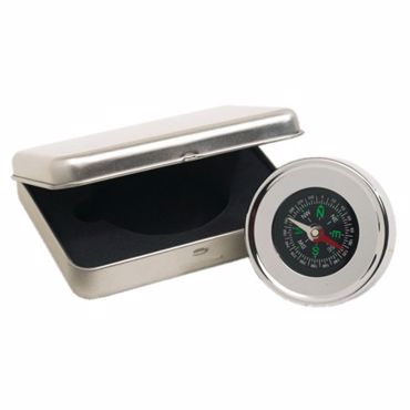 Boussole "Navigation" avec large bordure métal et optique chrome, dans boite métal