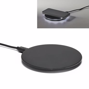 Chargeur sans fil ABS rétro-éclairé avec finition en caoutchouc. Ce chargeur a un câble micro USB qui permet une charge rapide. Le chargeur a des entrées 5V / 2A et 9V / 1'67A et une puissance de charge de 10W. ø99 x 9 mm | Câble: 1000 mm