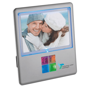 Tout en un clin d'?il! Avec ce cadre-photo dans son beau design c' est très facile pour vos clients. Il offre un espace pour une photo de vos chers (10 x 15 cm) ainsi que pour votre publicité (à gauche ou à droite d' écran). L' écran illuminé multicolore indique l' heure, le date actuel, le jour de semaine ainsi que la température ambiante. Nous vous proposons une gravure laser à côté de l' écran (à gauche ou á droite). Emballage: carton individuel. 3 piles AAA à commander.