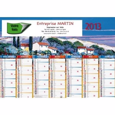 Le calendrier bancaire mini contrecollé AYMERIC est un calendrier publicitaire contrecollé, 7 mois par face. Phases lunaires, congés scolaires, trou de suspension.