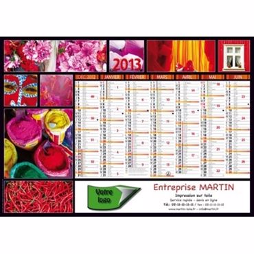 Le calendrier bancaire mini contrecollé CAMELEON est un calendrier publicitaire contrecollé, 7 mois par face. Phases lunaires, congés scolaires, trou de suspension.