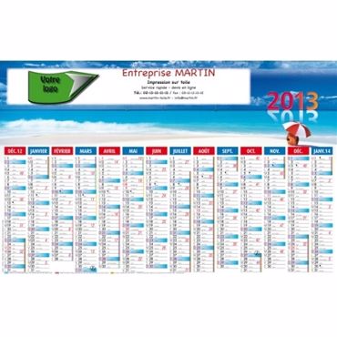 Le calendrier bancaire mini contrecollé PLAGE est un calendrier publicitaire contrecollé, 7 mois par face. Phases lunaires, congés scolaires, trou de suspension.