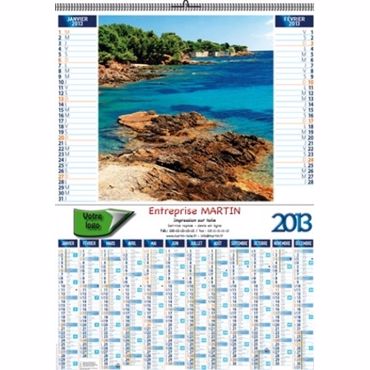 Calendrier mural Illustré COTES FRANCAISES. Calendrier illustré de photos 6 feuillets & planning 12 mois. Dimensions du repiquage : 255 x 40mm. 2 mois par page. 1 rainage pour pliage, pour envoi postal, reliure spirale métallique double blanche