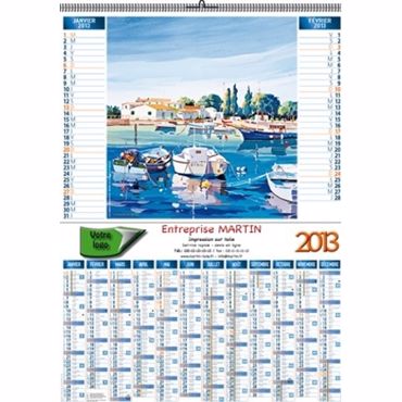 Calendrier mural Illustré FRONT DE MER. Calendrier illustré de photos 6 feuillets & planning 12 mois. Dimensions du repiquage : 255 x 40mm. 2 mois par page. 1 rainage pour pliage, pour envoi postal, reliure spirale métallique double blanche