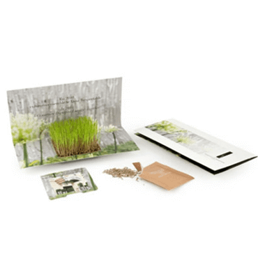 Une carte de vœux qui permet de faire pousser un coin de verdure sur votre bureau. Les graines poussent en 10 jours et mettent en relief une communication positive. Un cadeau original et nature entièrement personnalisé.