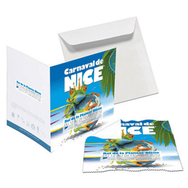 La double carte est un support de communication impactant et inédit ! La carte de voeux est accompagnée d'un essuie-verres, Un petit cadeau en plus de la carte de v?ux traditionnelle. Cet essuie-verre est très utile, il permet de nettoyer à la fois les verres de lunettes, mais également l?écran de votre téléphone portable ou bien celui de votre ordinateur. Cet objet publicitaire vous permettra de communiquer de manière originale. Vous disposez d?une surface de marquage importante sur la carte et la microfibre. Possibilité de mise sous enveloppe et de routage Poids total (enveloppe + microfbre + carte) inférieur à 20 grammes pour un envoi économique Sur devis à partir de 10000 pièces