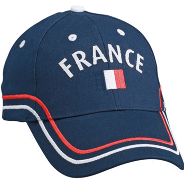 Casquette pays 6 Panneaux. -Broderies contrastés sur le tour de la casquette. -6 Oeillets d'aérations brodés. -Fronton renforcé. -Visière préformée. -Bandeau de transpiration satin. -Fermeture Velcro. -Drapeau et nom France brodés. -100 % coton twill moyen. -