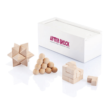 Boîte en bois de pin blanc comprenant 3 casse-tête, fond de la boîte en feutre bleu, couvercle glissant pour ouverture. Emballé dans une boîte noire.