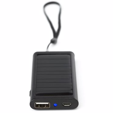 Chargeur solaire en aluminium d'une capacité de 800 mAh avec une sortie USB pour MP4 et smartphones. Li/battery 800mAh, avec 5V/70mA 0.35W capteur solaire, avec entrée 5V/1A, et sortie 5V/1A, inlcus un câble de charge.