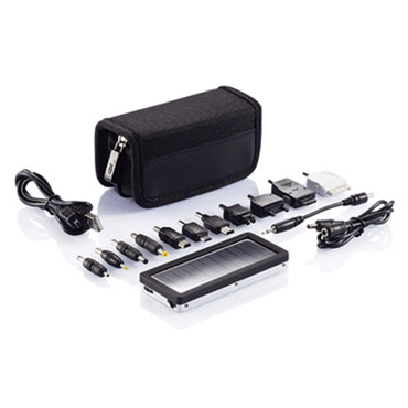 Set solaire avec batterie lithium rechargeable de 950mAh. Sortie 5V/max. 800mA et 12 adaptateurs différents pour téléphones mobiles, 1 câble USB (entrée) et 1 câble de connexion (sortie). Y compris pochette noire zippée avec patch en PU.