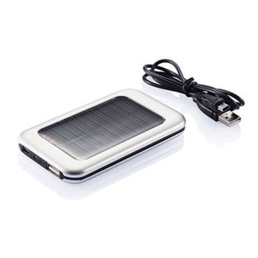 Panneau solaire dans un boîtier en aluminium anodisé avec batterie lithium rechargeable de 2600mAh, sortie 5V/500mA ou 1000mA, pour recharger téléphones mobiles et tablettes électroniques. Il suffit d'adapter le voltage aux besoins de l'appareil à charger. Y compris câble de connexion et pochette en velours noir avec cordelette.