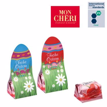 Chocolat mon chéri. Mon Chéri en fourreau publicitaire. Attention, pause estivale! Motifs standards: 1.Oeuf de Pâques rouge 2.Oeuf de Pâques bleu