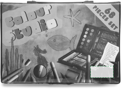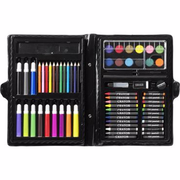 Coffret à dessin de 68 pièces comprenant des crayons de couleur, des feutres, des crayons gras, des pastilles de peinture,des pinceaux, gomme, règle, taille-crayon.