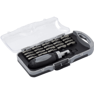 Set de vissage avec cliquet contenant 20 embouts cruciformes, plats et Torx.