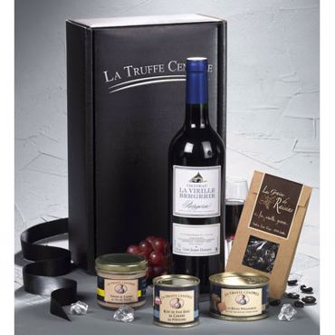 Coffret au coeur du perigord - Coffret noir et argent "La Truffe Cendrée" - Un Bloc de Foie Gras de Canard du Périgord (IGP Périgord) de 100g - Un Délice Périgourdin au Foie de Canard (avec 20 % de foie gras) de 130g - Un Bocal de Terrine de Canard au Jus de Truffes de 100g - Les Grains de Raisins au Chocolat aromatisés à la Vieille Prune "Louis Roque" de Souillac Etui de 120G - Une Bouteille de Bergerac Rouge "Château la Vieille Bergerie" Cuvée Jacques de 75 cl