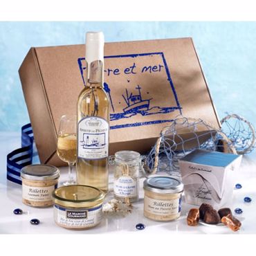 Coffret gastronomique le marché côtier. - Coffret carton recyclé sérigraphié "Terre et Mer" - Un Bocal de Bloc de Foie Gras de Canard à la Fleur de Sel de Guérande de 130g - Un Bocal de Rillettes de Saumon Fumé de 90g - Un Bocal de Rillettes de Thon au Poivre Vert de 90g - Un Bocal de Sel de Guérande aux Algues de 50g - Une Boîte de Truffes aux Eclats de Caramel au Beurre Salé de 100g - Une Bouteille d'Apéritif du Pêcheur 11,5° de 37,5 cl