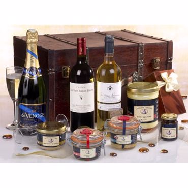 Coffret la grande malle - Grande Malle bois rétro - Un Bocal de Foie Gras de Canard Entier du Périgord (IGP Périgord) de 180g - Un Bocal de Foie Gras d'Oie Entier du Périgord de 130g - Un Bocal de Terrine de Magret d'Oie au Foie d'Oie ( avec 20 % de foie gras) de 180g - Un Bocal de Confit de Canard (2 cuisses) de 750g - Un Bocal de Chutney de Figues de 115g - Un Ballotin de Chocolats assortis artisan français "l'Invitation Gourmande" de 200g - Une Bouteille de Sauternes "Château Gravas" 2009 de 75 cl Guide hachette des Vins - Une Bouteille de Saint-Emilion Grand Cru "Château Clos Saint Emilion Philippe" 2009 de 75 cl - Une Bouteille de Champagne Brut Sélection Cordon Bleu "de Venoge" de 75 cl Guide Hachette des Vins