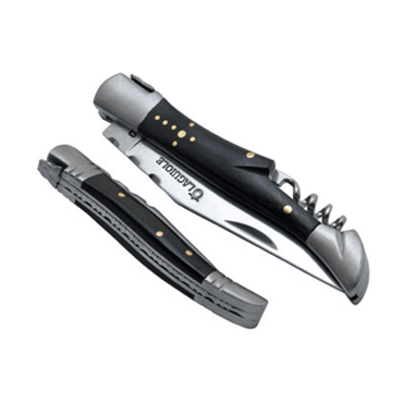 Combinaison de 2 couteaux Laguiole dans un coffret en bois noir, comprenant un laguiole 9 cm et un laguiole 12 cm avec tire-bouchon. Lames en acier 420, manches en stamina noir, 2 mitres forgées en acier inoxydable.